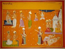| Description / विवरण | Miniature painting based on Vrihat katha depicting a Pundit applying tilak to a king in upper right corner. Besides them, two standing men are talking and a yogi seated with Shiv. In the lower right part, a goddess is standing in front of two nobles and then killing them both. |