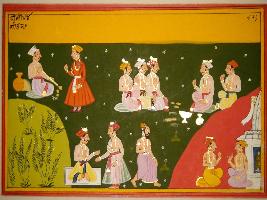 | Description / विवरण | Miniature painting based on Vrihat katha depicting five nobles in the upper part, eating food together. In the lower part, two nobles - one sitting and other standing, a man walking and two men sitting outside a temple are shown. |