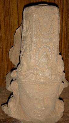 | Description / विवरण | Vishnu head, wearing a Kirti mukuta and earrings. His nose and chin are slightly rubbed off. |