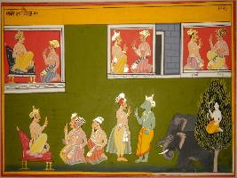 | Description / विवरण | Miniature painting based on Vrihat katha depicting a king and nobles conversing at two upper panels. At the lower right part, king is shown sitting with three nobles. A man is shown talking to an animal headed man. At the far corner, Kamdev is sitting on a tree. |