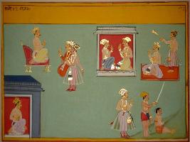 | Description / विवरण | Miniature painting based on Vrihat katha depicting a king sitting on throne and talking to two standing ministers, a man sitting inside a house, two seated men talking inside a house, king sitting with a Chauri bearer standing behind him, a man with a sword holding a prisoner whose hands are tied. Near by a noble is shown asking him to stop. |