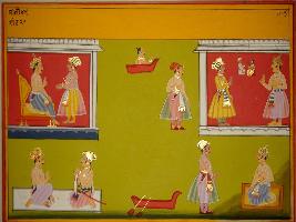 | Description / विवरण | Miniature painting based on Vrihat katha depicting a king sitting on throne and talking to his noble, a man on viman, a man standing outside a house, where two standing men are talking, a king seated with a warrior, a boat, and a minister talking to a seated king. |