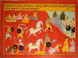 | Description / विवरण | Miniature painting based on Mahabharat - Ashwamegh parva depicting Meghvaran taking away horse of yagna. Gods including Indra shown sitting in viman and showering flowers over them. |