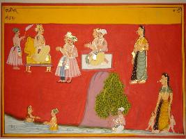 | Description / विवरण | Miniature painting based on Vrihat katha depicting sitting with nobles at upper the right part, A woman is depicted walking at upper left art. Below this, She is shown holding two boys and going towards river. To her right, a man is sitting under a tree. At the lower right, a woman shown with a noble in a river. |
