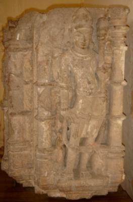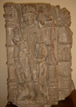| Description / विवरण | Sculptured architectural fragment, lower part of the pillar depicting Yam holding Kharbhanga with left hand and right hand resting on waist. His vahan buffalo is depicted below. On the right back of the figure depicting Narita, four handed, attributes from right below 1 head of a man 2 a sword 3 a club 4 Kartavya-lambit pose. A corpse is lying below his feet. |