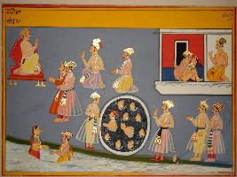| Description / विवरण | Miniature painting based on Vrihat katha depicting a king talking to four ministers, a couple standing in the river, two men standing on either side of a circular pond, in which number of heads are seen. While at the upper left side union of man and a woman is taking place. |