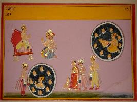 | Description / विवरण | Miniature painting based on Vrihat katha depicting a king seated throne with two nobles seated in front of him, two circles of water ponds with number of heads in them. A king is looking in the pond in the right side. A family is coming towards it. |