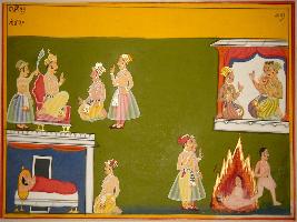 | Description / विवरण | Miniature painting based on Vrihat katha depicting seated and two men listening, below them a king lying on bed and a man is sitting outside. At the left side, three seated men are talking and a nude man is shown coming out from the fire whereas, two bodies are burning. |