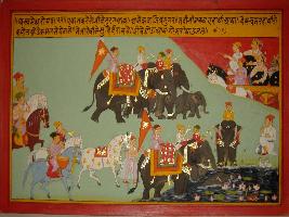 | Description / विवरण | Miniature painting based on Mahabharat - Ashwamegh parva depicting horse of Ashwamegh going near lake. A group of elephants are shown coming toward lake and taking bath. One of elephant is seen plucking lotus with trunk. |