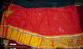 | Description / विवरण | Lahanga made of cotton. It is plain with designed border with geometrical designs. It is red in colour and border is of yellow and black colours. |