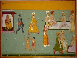 | Description / विवरण | Miniature painting based on Vrihat katha depicting a seated woman in house, a man wearing a transparent chunri, a man with a money bag, two children walking, a woman with a raised hand, a king seated with his ministers and two soldier coming to a king. |