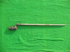 | Description / विवरण | It is an Italian Baynot. It has triangular shape blade. All three edge of the blade is sharp and tip is pointed. It has a cylindrical hook with screw. |