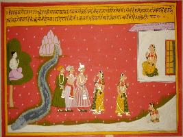 | Description / विवरण | Miniature painting based on Vrihat katha depicting a king, a Purohit and a Minister talking with a woman named Upakosa, She is shown talking bath in the river Ganga in the left side of the painting. |