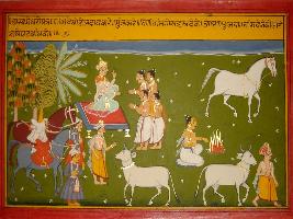 | Description / विवरण | Miniature painting based on Mahabharat - Ashwamegh parva. It is depicting a king performing Ashwamegh yagna and leaving horse. He also gave thousand cows as alms. |