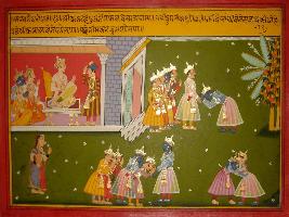 | Description / विवरण | Miniature painting based on Mahabharat - Ashwamegh parva. Yudhisthir is depicted sitting on a throne in palace and when he is informed of Krishna s arrival all the Pandavas came out to receive him and all the Pandavas are depicted receiving Krishna. |