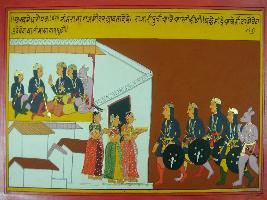 | Description / विवरण | Miniature painting based on Mahabharat - Ashwamegh parva depicting seeing Bhim coming inside the palace, the princes welcoming him. She is then sitting inside with Bhim and is talking with other warriors. |