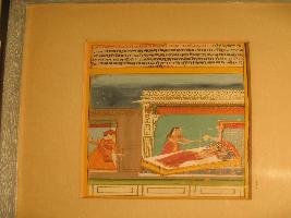 | Description / विवरण | It is depiction of Ragini Lalita. In this paintng queen is taking rest on the bed and servant is standing with fan in the room. The king is watching this scene. Background has beautiful doors and room. |