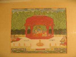 | Description / विवरण | In this paintng Krishna and Radha are sitting on the bed. In the hand of Krishna is flute. Some musicians are sitting and singing. Musician is holding Veena and Dholak. The background has big leaves. Some peacock and birds can be seen behind the big leaves. |