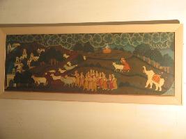 | Description / विवरण | It is a Krishna and Indraraj painting with some cows and cow-herdesses, some men are wearing red, yellow brown gown and females are wearing long skirt and green, yellow blouse. |