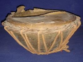 | Description / विवरण | Drum, whose lower part is made of Copper and upper is cover with leather by torn. |