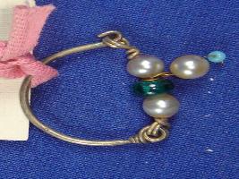 | Description / विवरण | A silver earring with one green, three white and one turquoise pearls. |