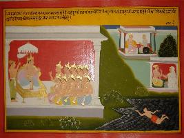 | Description / विवरण | Miniature painting based on Mahabharat - Bhishma parva depicting Sanjay is telling Dhritrashtra that Duryodhan is discussing with Bhishma and other warriors about Karna s inclusion in war and Bhishma is teling him not to hear Karna s advice. |