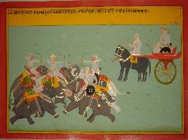 | Description / विवरण | Miniature painting based on Mahabharat - Bhishma parva depicting Ghototkacha and Bhagadatta are fighting with each other by mounting on their elephants. |