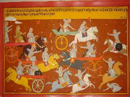 | Description / विवरण | Miniature painting based on Mahabharat - Bhishma parva. The painting depicts Duryodhana, Shalya, Lal Singh and Suluchan all are attacking on Bhim. |