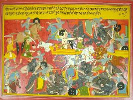 | Description / विवरण | Miniature painting based on Mahabharat - Drona parva depicting Vigorous war between Kauravas and Pandav army. |