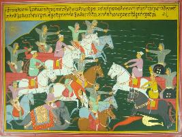 | Description / विवरण | Miniature painting based on Mahabharat - Drona parva. The painting depicts a fighting scene in between the Pandav and Kauravas and the painting says that Pandav fight very bravely. |