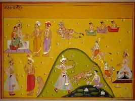 | Description / विवरण | Miniature painting based on Vrihat katha depicting a king and a queen seated together donating to two men and two tigers watching them. Two kings are talking to each other at the lower right side. A king is hunting a tiger at the middle. Shiv shown seated on tiger in the left side. |