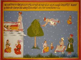 | Description / विवरण | Miniature painting based on Vrihat katha depicting a couple seated on the right lower part of the painting, above them a man holding his magic sandals and watching a sleeping woman. In the left he is seen flying in the air. Below it, a king is seated with a lady and a girl. |