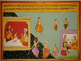 | Description / विवरण | Miniature painting based on Vrihat katha depicting a woman, a child with two other persons in the right side of the painting. In the left, a dancer and a drummer are being depicted, while on the left side, two men are seated with two children in a house. |