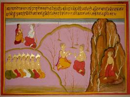 | Description / विवरण | Miniature painting based on Vrihat katha. Shiv and Parvati are depicted talking, two sages are sitting and talking in a garden, story of ten kings is depicted and one sage is depicted in a hill. |