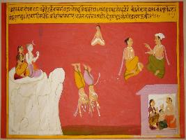 | Description / विवरण | Miniature painting based on Vrihat katha. Shiv and Parvati are depicted sitting on Kailash mountain. Two men are jumping into the water. In the other side a man is sitting in meditation pose, two seated men talking and a family sitting in their house. |