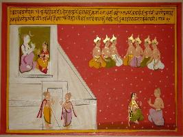 | Description / विवरण | Miniature painting based on Vrihat katha. Shiv and Parvati are depicted sitting in a palace and palace is guarded by two Shiv ganas. In the other side, seven kings are depicted talking. Below them, Shiv and Parvati are depicted talking. |