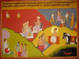 | Description / विवरण | Miniature painting based on Mahabharat - Drona parva. It depicts Karna saying to Dronacharya that without commander, an army becomes direction less same as Boat without sailor, charriot without drives. Then Karna praises Drona that as Mahadev in 11 rudras, as Kubera in Jakhya and Indra in gods, you are supreme in commander. |