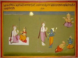 | Description / विवरण | Miniature painting based on Vrihat katha depicting Shiv and Parvati in the right side of the painting. Shiv is telling Parvati about the worship of Vishnu and Brahma and his influence on them. |