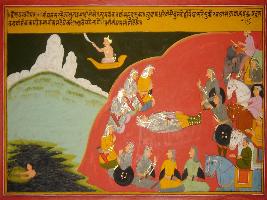 | Description / विवरण | Miniature painting based on Mahabharat - Drona parva depicting Bhishma lying on Bed of arrow and Karan come to meet him and touches his feet. |