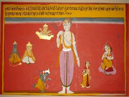 | Description / विवरण | Miniature painting based on Vrihat katha depicting Mahadev in the centre of the painting. Parvati asks Mahadev that Brahma should go to heaven and Vishnu to hell pataal . |