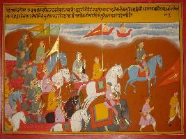 | Description / विवरण | Miniature painting based on Mahabharat - Drona parva depicting Karan becoming commander of Kaurvas, and taking blessing from Bhishma and moves in the battle field on charriot. He moves with army some of Indra moves in viman with Devtas. |