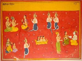 | Description / विवरण | Miniature painting based on Vrihat katha depicting Nag Purush and two Devtas in the upper part of the painting. In lower right part, a Nag Purush and a female with child are depicted, besides them, Vidyadhars are depicted in viman. On lower left part, Shiv and Parvati with a Shivgana are depicted. |