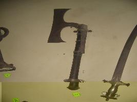 | Description / विवरण | It is a farsi having broad blade. The tip is sharp also upper side of main blade is semi circular in shape. The blade is joint with wooden handle with grip. The wooden handle s lower portion is covered by thin iron sheet. |