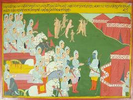 | Description / विवरण | Miniature painting based on Mahabharat - Gada parva. The painting depicts Pandavas alongwith their army is standing in front of Krishna and Krishna asking something to Arjun. The painting also depicts some desendent from Hanuman in dancing position. |