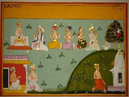 | Description / विवरण | Miniature painting based on Vrihat katha depicting in the upper right part, a king discussing with ministers and Pundits. He is talking to Brahman in the lower left part. Brahman asks him to worship Shiv and the king goes to Shiv s temple, depicted in the lower left part. He is depicted worshipping Shiv linga in the upper left part. |