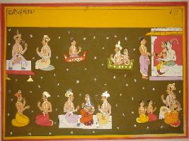 | Description / विवरण | Miniature painting based on Vrihat katha depicting a king with noble in the upper right part, besides them Vidyadhars and king with queen are depicted in Viman. On upper left part a Brahman is depicted in front of Shiv and Parvati. In the lower right part, two Brahmans are depicted and besides them, a king with queen and his minister are depicted. In the lower left part, a king and queen is depicted with two children. |