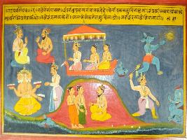 | Description / विवरण | Miniature painting based on Mahabharat - Gada parva depicting Vaishpayan sage istelling Parikshit about story of Indra getting brahma hatya. There was a demon named peli who entere inside sun in a fraid of Indra. Indra followed him and killed him. |