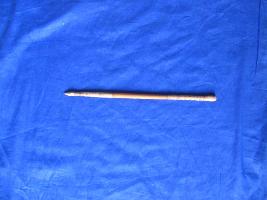 | Description / विवरण | Tip is like spear, cylindrical in bottom but top is four face and pointed. Sharp in edges. Bottom and top of the stick is having floral design in red, white, golden black colour on light orange background. Bottom has U shape grove . |