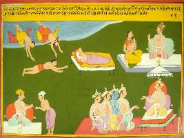 | Description / विवरण | Miniature painting based on Mahabharat - Rajdharma parva depicting Yudhisthir telling his brothers about life. He says life is full of birth, death, silkness and pain, and happiness too. All sages and Devtas want to go heaven then who will stay on earth. He also says that he become a king due to his many acts, and one who falls from heaven will achieve heaven again after hard penance. |