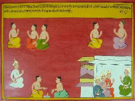 | Description / विवरण | Miniature painting based on Mahabharat - Rajdharma parva depicting vasu, grandson of Vishwamitra shown talking to Parsuram in a court about his pledge of destroying king from earth. He is telling him, if he carry on his killing earth would deprived of rule and would suffer a lot. |